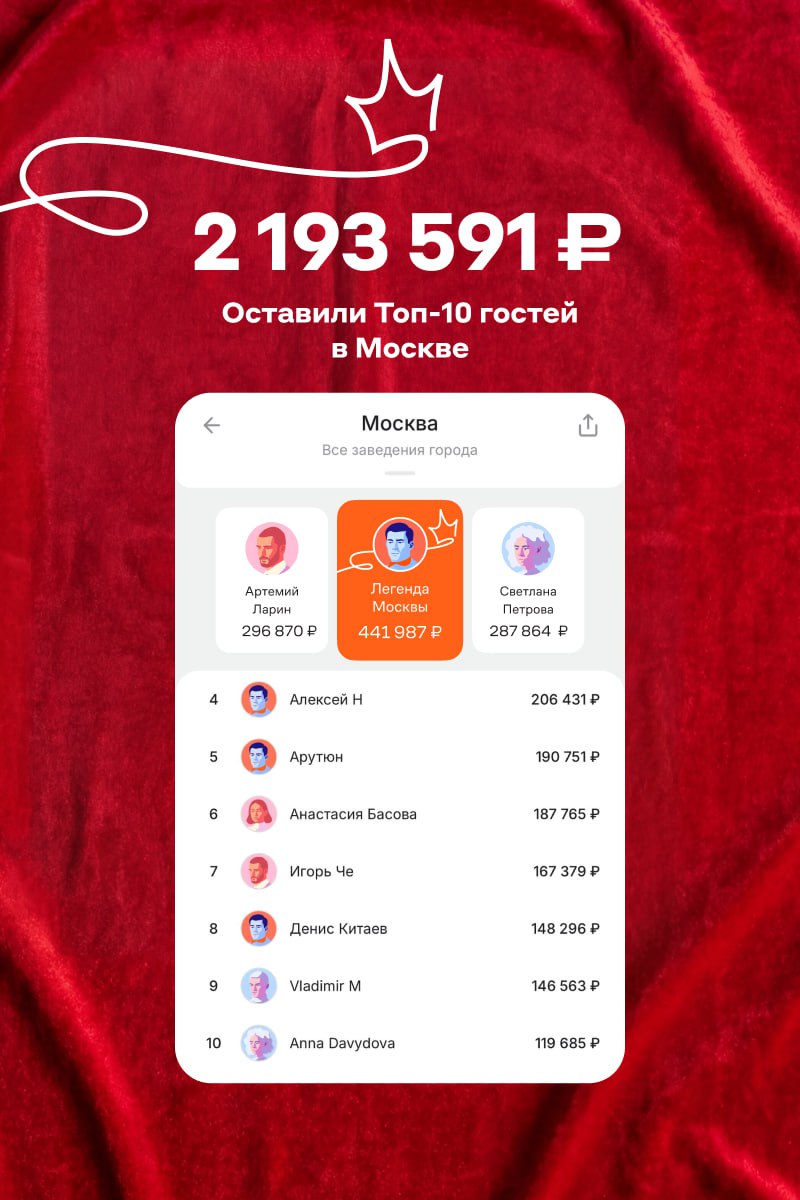 Сервис отзывов и чаевых Нетмонет считает чаевые до рубля. Больше оставляете — выше поднимаетесь в рейтинге сами. И поднимаете свой город. А лидер становится ЛЕГЕНДОЙ ЗАВЕДЕНИЯ — о нём узнают ВСЕ⚡️