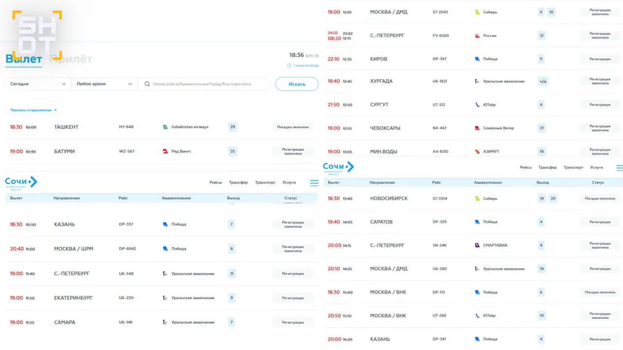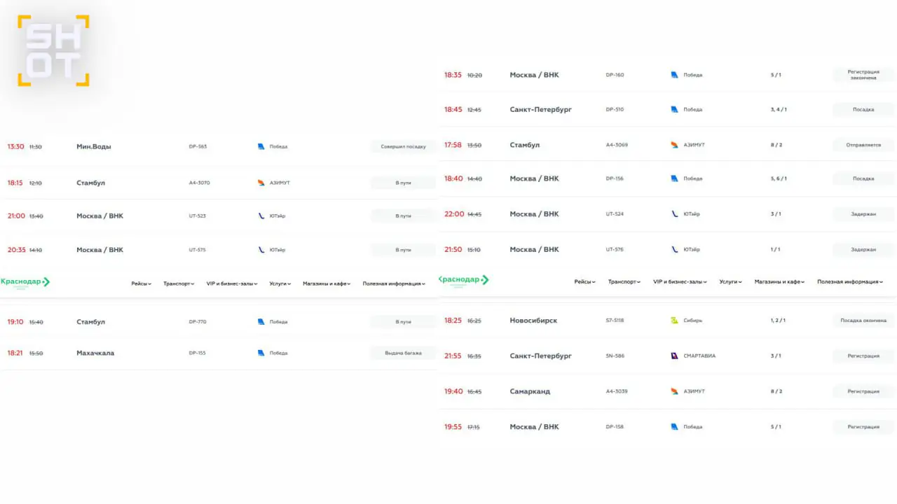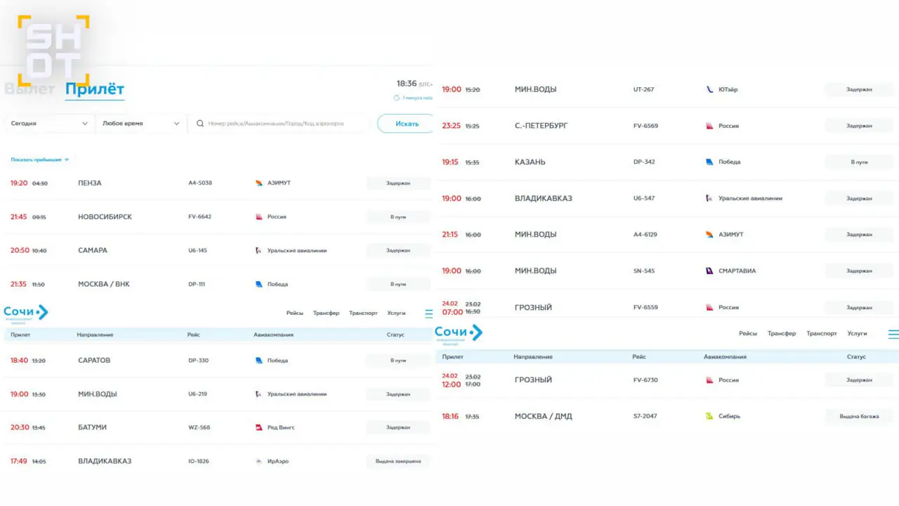 Как выяснил SHOT, в городе-курорте Сочи задержано 33 рейса на прилёт и 28 на вылет. Среди направлений такие города, как Москва, Питер, Стамбул, Хургада, и другие. Задержки доходят до 15 часов — взрослые и дети сидят и спят на полу из-за нехватки мест. Отменено десять полётов. Несколько самолётов ушло на запасные аэродромы. Чуть лучше ситуация обстоит в Краснодаре, где задерживается 33 рейса, ещё пять сорвано.