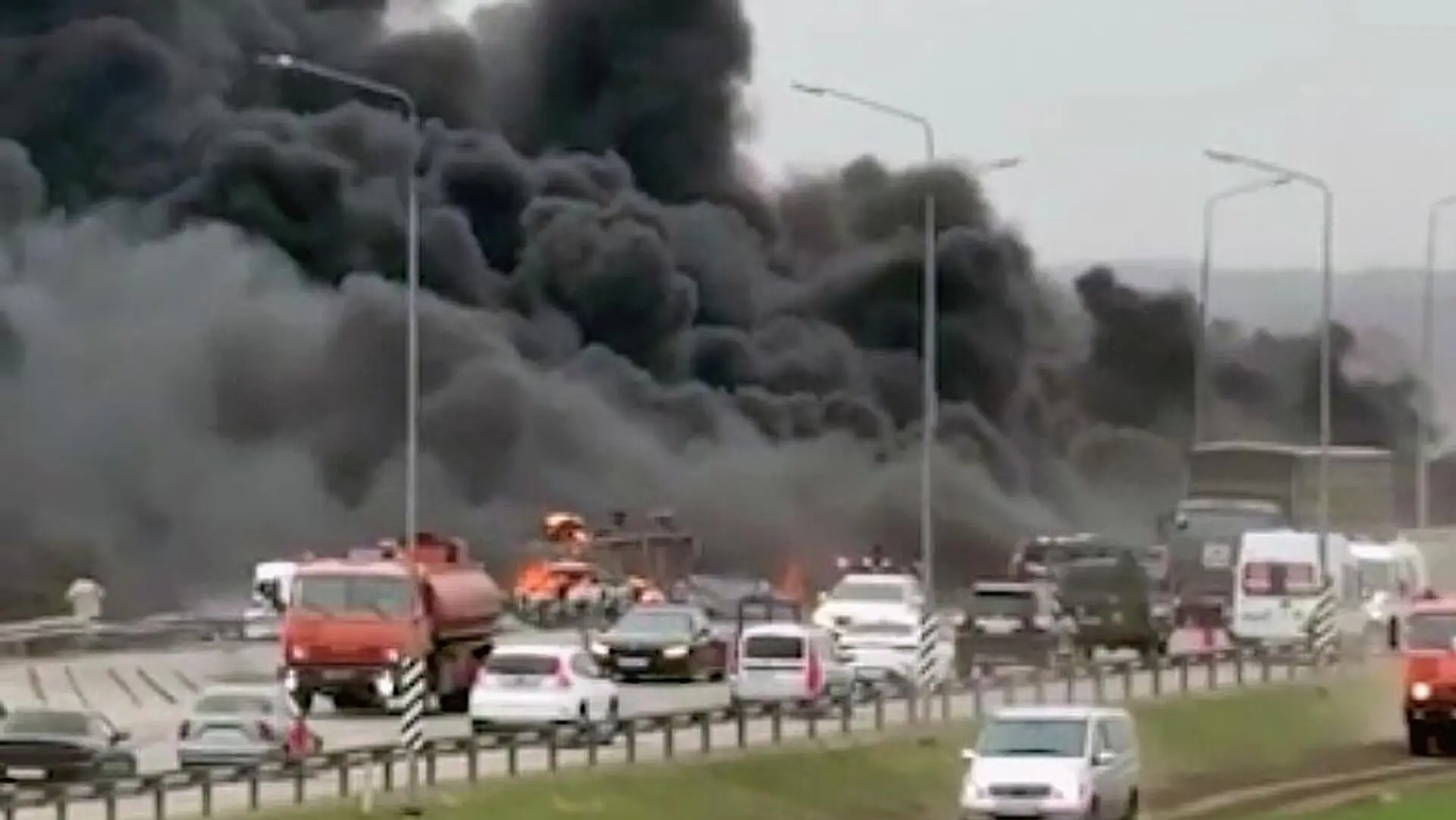 В субботу днем на 34-м километре автодороги «Ростов — Таганрог» столкнулись бензовоз и четыре легковых автомобиля. Бензовоз загорелся. Сообщалось, что погибли три человека, еще двое пострадали.