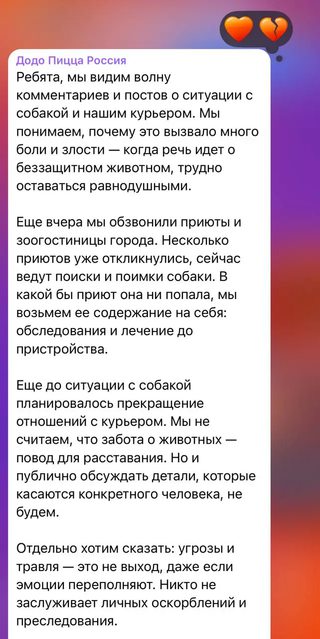 «Додо Пицца» обещает позаботиться о собаке.