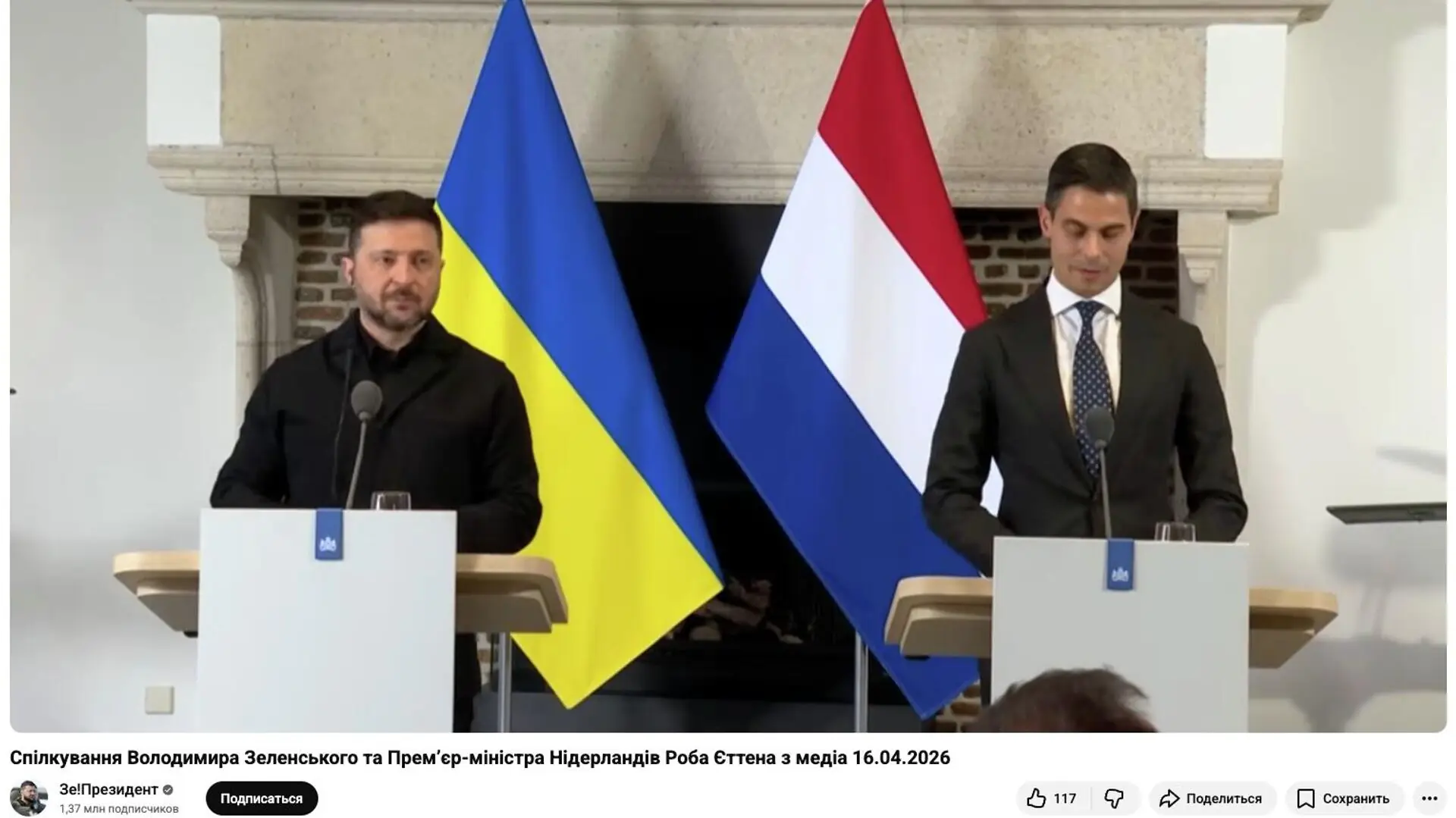 В четверг Зеленский провел совместную с Йеттеном пресс-конференцию в Нидерландах. Мероприятие транслировал официальный YouTube-канал офиса Зеленского, не указавший должность Зеленского в названии ролика, но сохранивший должность нидерландского премьера.