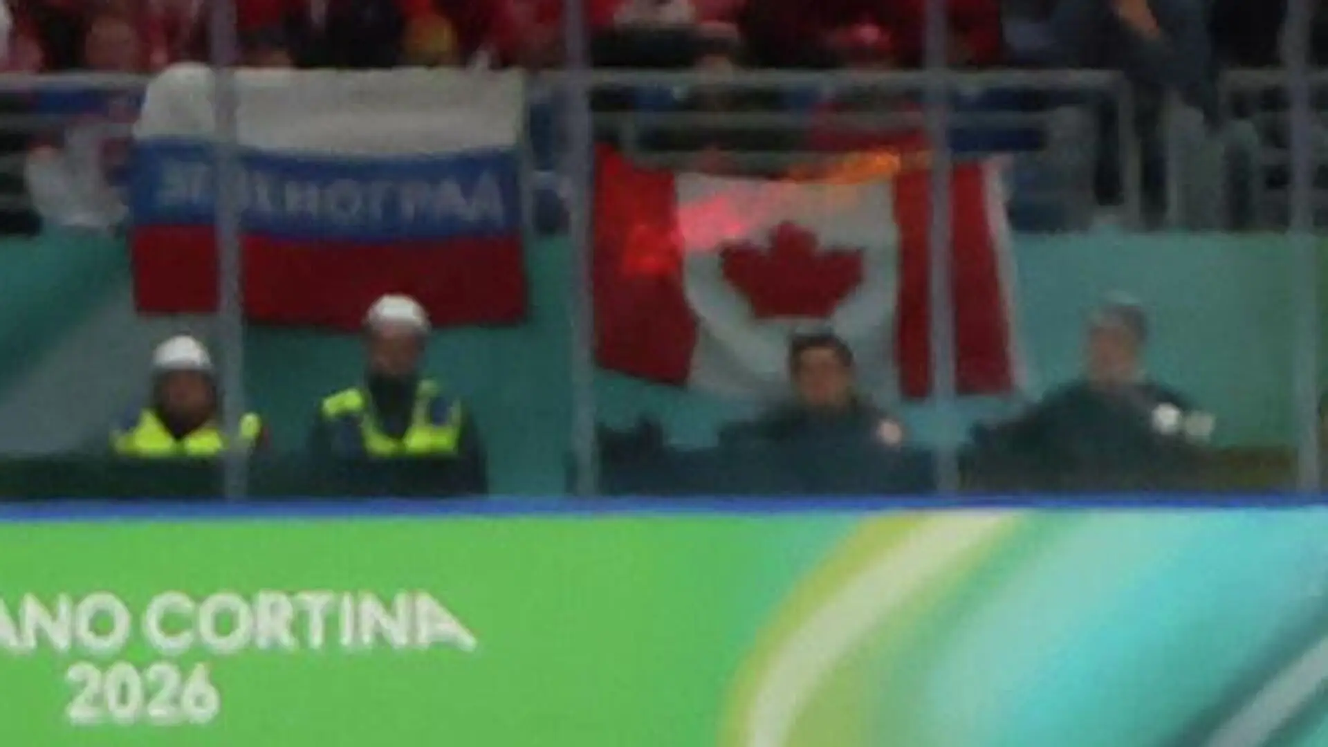 Встреча проходит в Милане, по итогам первого периода сборная Чехии обыгрывает команду Канады со счетом 2:1. Болельщики вывесили флаг России рядом с канадским. Как отмечает Okko, через несколько минут к зрителю в форме московского «Спартака» подошел стюард и попросил убрать российский флаг, на котором было написано «Зеленоград».