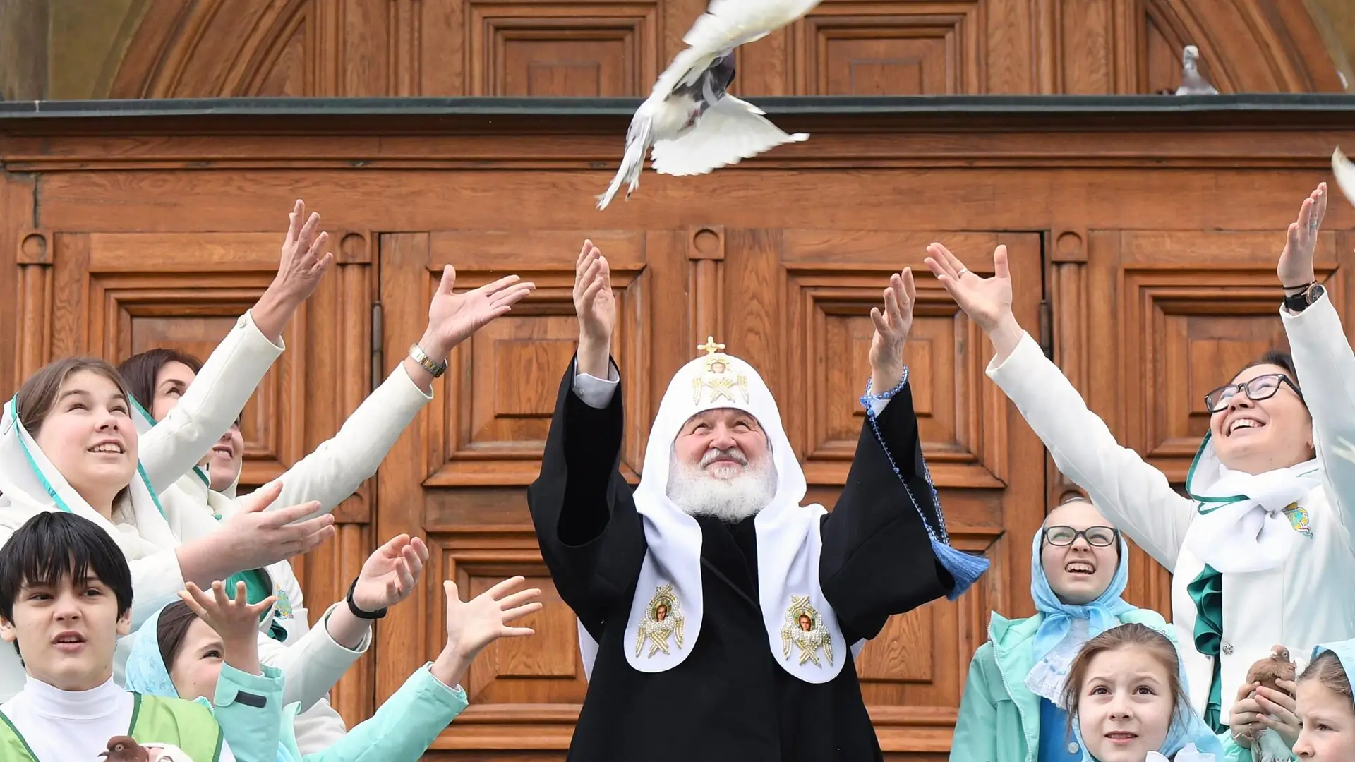 Патриарх выпустил голубей у стен Благовещенского собора Московского Кремля, где ранее совершил литургию.