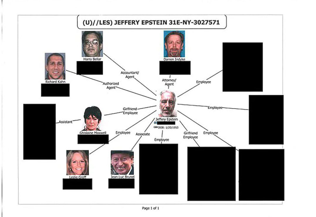 — среди опубликованных файлов — схема связей Эпштейна с его предполагаемыми сообщниками, часть личностей скрыты. Среди фотографий — адвокат Эпштейна, его сообщница Гислейн Максвелл, финансовый советник, бухгалтер и помощник.