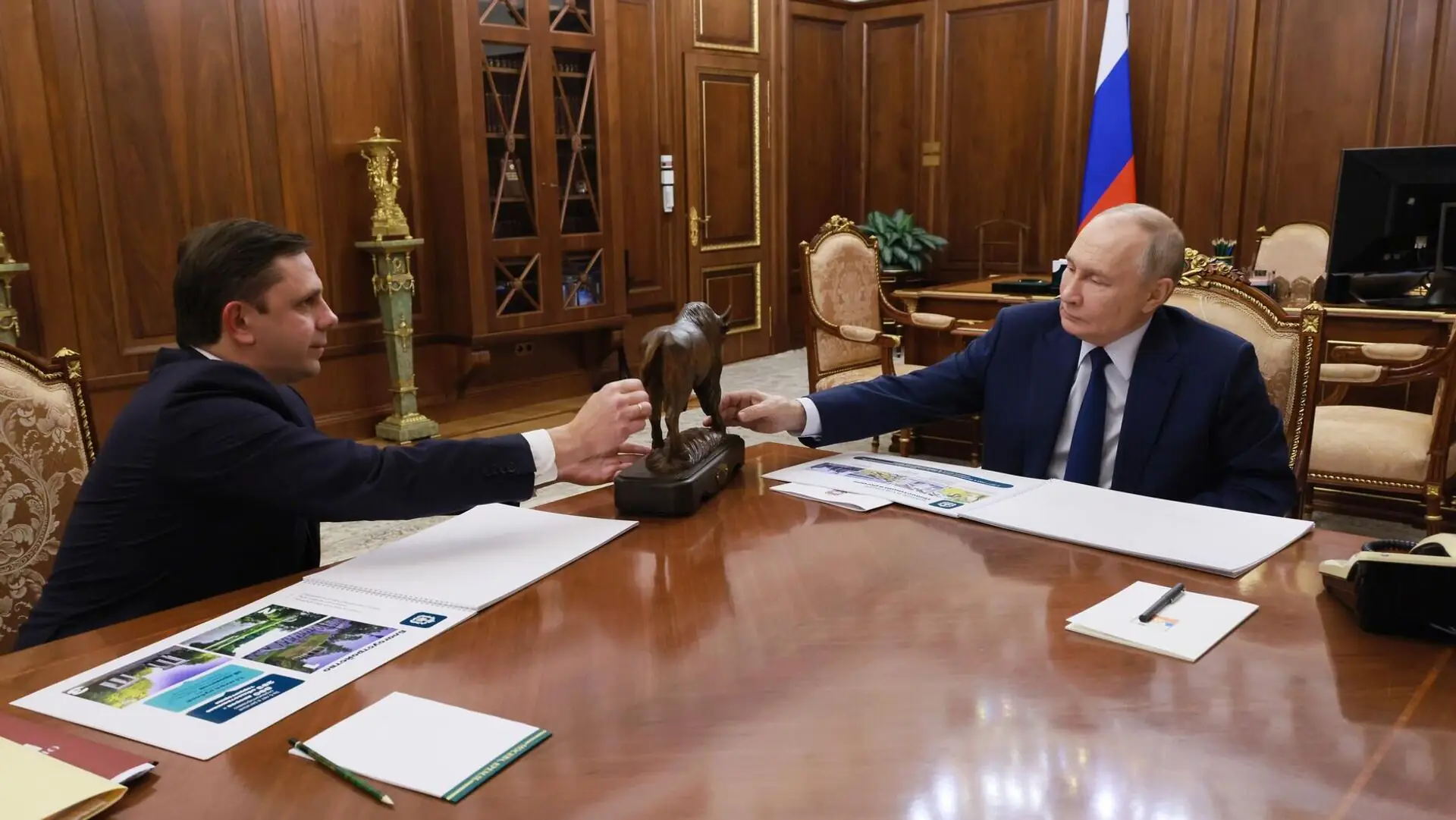 «Позвольте, небольшой сувенир от Орловской области — зубр, который сейчас является одним из символов Орловской области. Мы постараемся и дальше продвигать эту идею», — сказал Клычков, передавая сувенир.