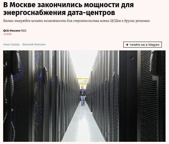 Интернет в Москве станет медленнее и дороже из-за дефицита электроэнергии для дата-центров — все мощности до 2030 года уже забронированы, пишут СМИ.