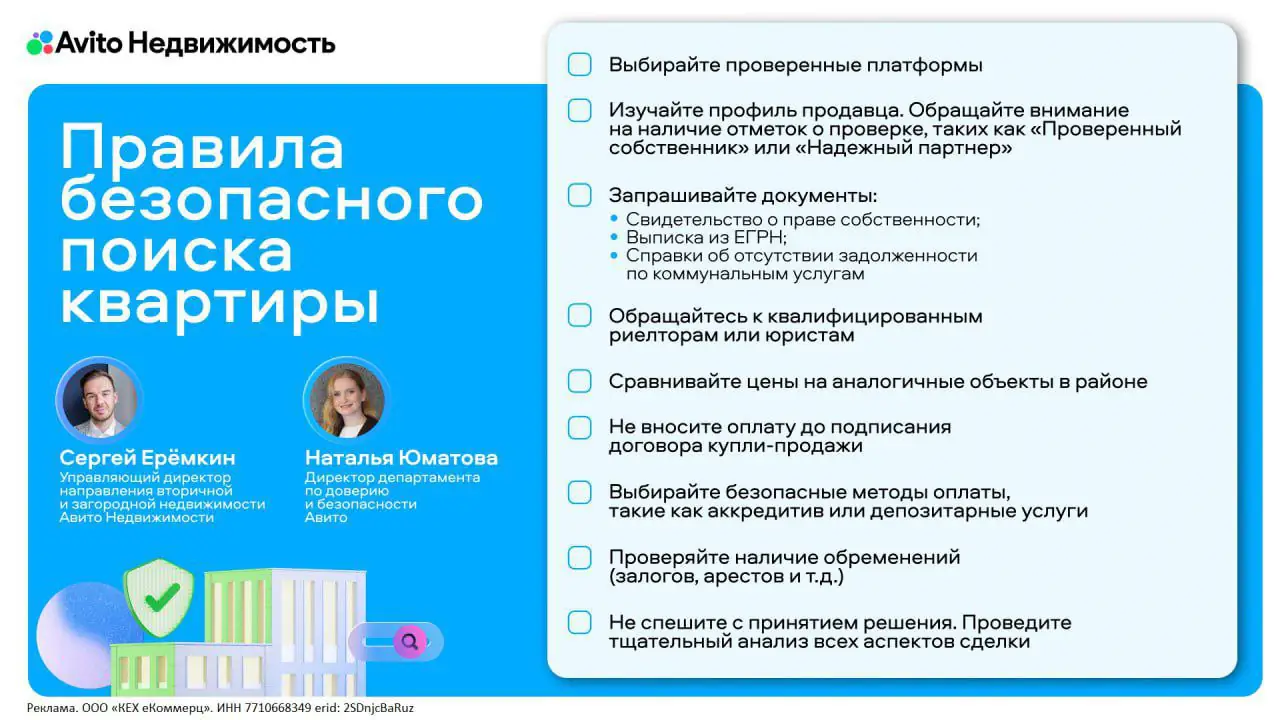 Безопасность остаётся ключевым фактором при покупке квартир. Пользователи проводят проверку в два этапа. Сначала — цифровая: респонденты смотрят отзывы и рейтинги продавцов (58%), отметки об экспертизе (53%) и репутационные значки (40%). Затем — документальная и экспертная: на первичном рынке треть пользователей изучают застройщиков и консультируются с риелторами, на вторичном более половины опрошенных проверяют право собственности, выписки из ЕГРН и отсутствие задолженностей за ЖКУ.
