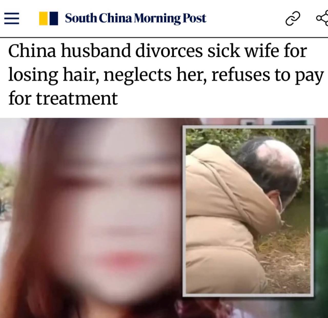 Китаец потребовал развод после того, как его жена начала лысеть из-за болезни.