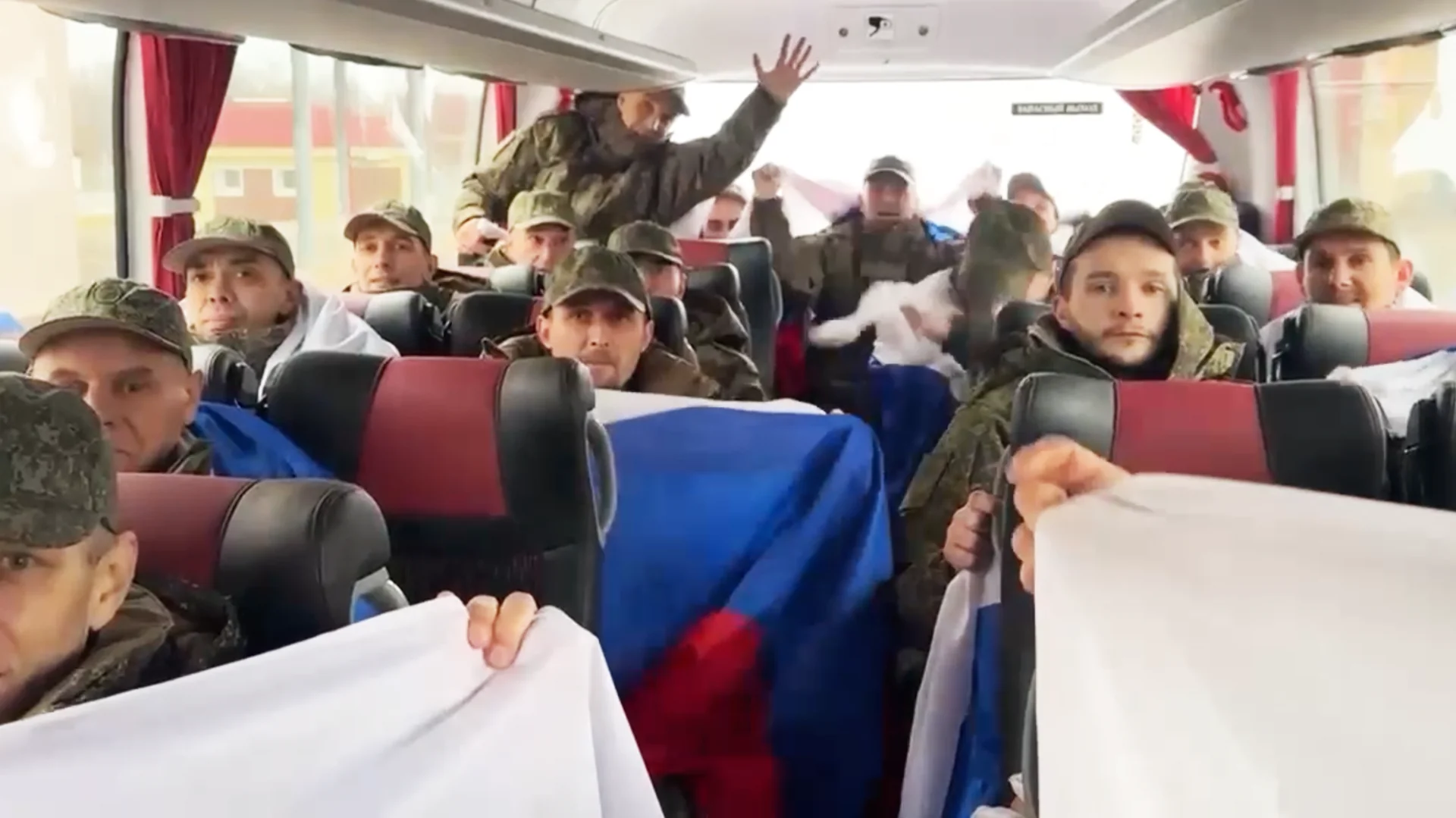 На видео показано, как военнослужащие садятся в автобус и благодарят тех, кто поздравляет их с возвращением.