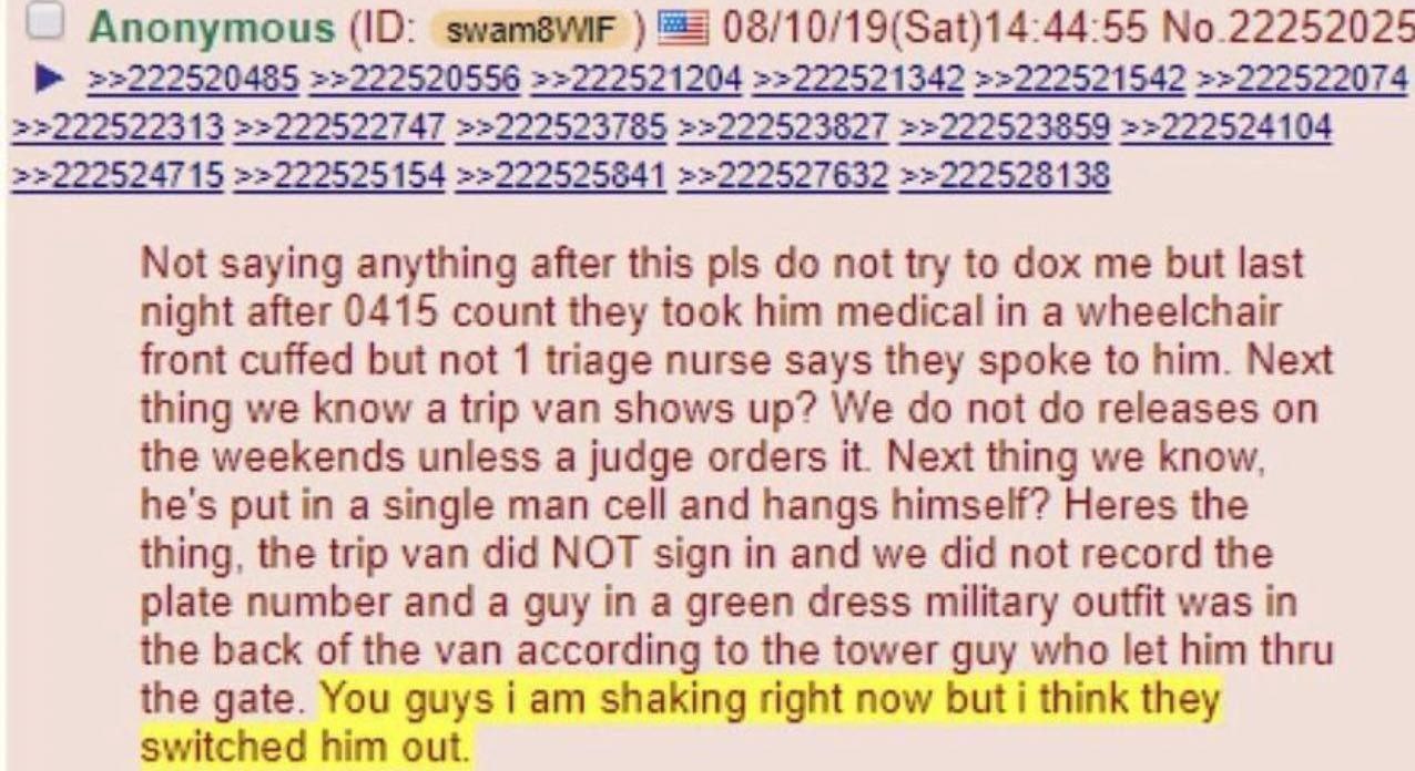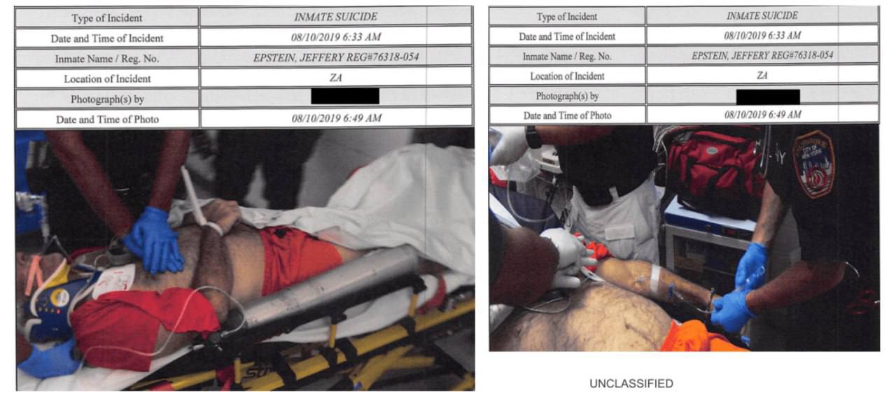 С 2019 года в утечках и рассекреченных документах периодически появляется версия, что смерть Джеффри Эпштейна в тюрьме могла быть инсценирована с подменой тела. На фото финансиста из скорой видно, что ему пытаются оказать помощь после травмы щитовидного хряща, полученной при якобы самоубийстве.