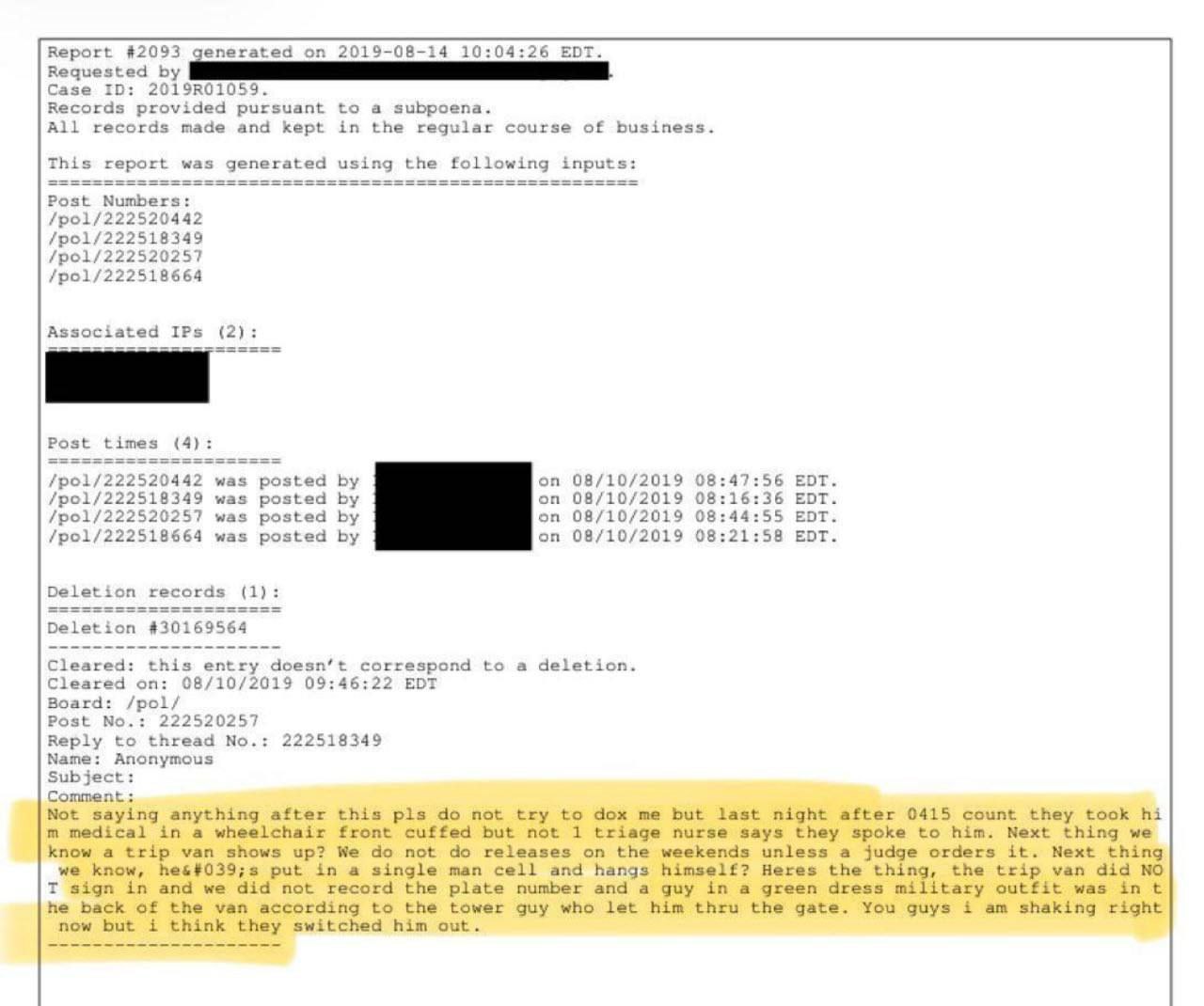 В медицинских записях отмечалось, что Эпштейн отрицал суицидальные наклонности и называл себя «трусом». Также он был евреем, а в иудаизме самоубийство запрещено. Сбои камер и исчезновение части материалов дела усиливают сомнения в официальной версии