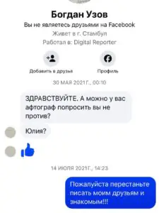Юлия встревоженно обратилась к своему окружению и попросила не отвечать этому человеку. Как именно зовут сталкера жена композитора не знает.