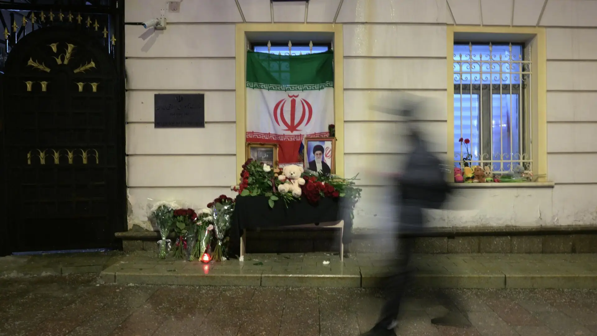 Утром в понедельник возле иранской дипмиссии в Москве обстановка спокойная, у входа в здание лежат цветы и мягкие игрушки, флаг Ирана приспущен в знак траура.