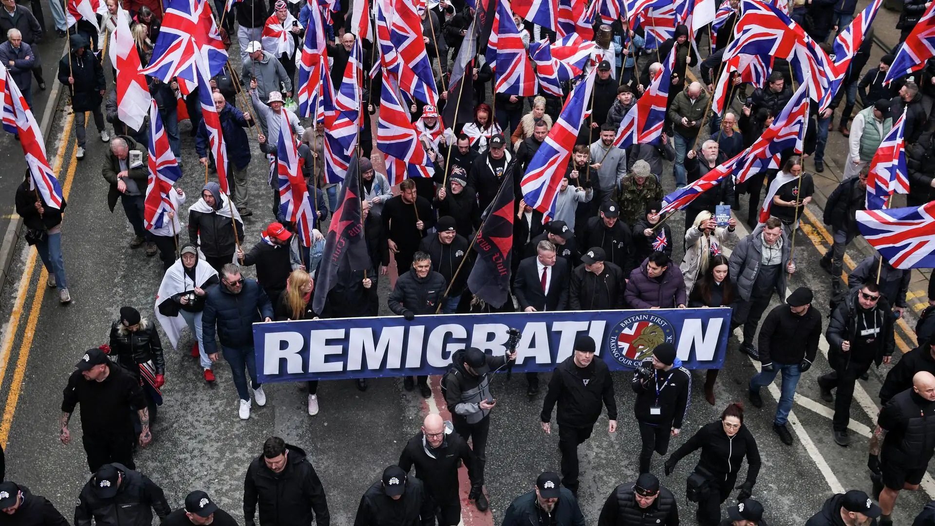 Толпа размахивает многочисленными флагами Англии и «юнион-джекками» — флагами Великобритании, а также флагами Шотландии, Уэльса и североирландских юнионистов. Ранее организаторы заявили, что приготовили для акции в три раза больше флагов, чем для прошлого марша, который прошел в августе 2025 года.