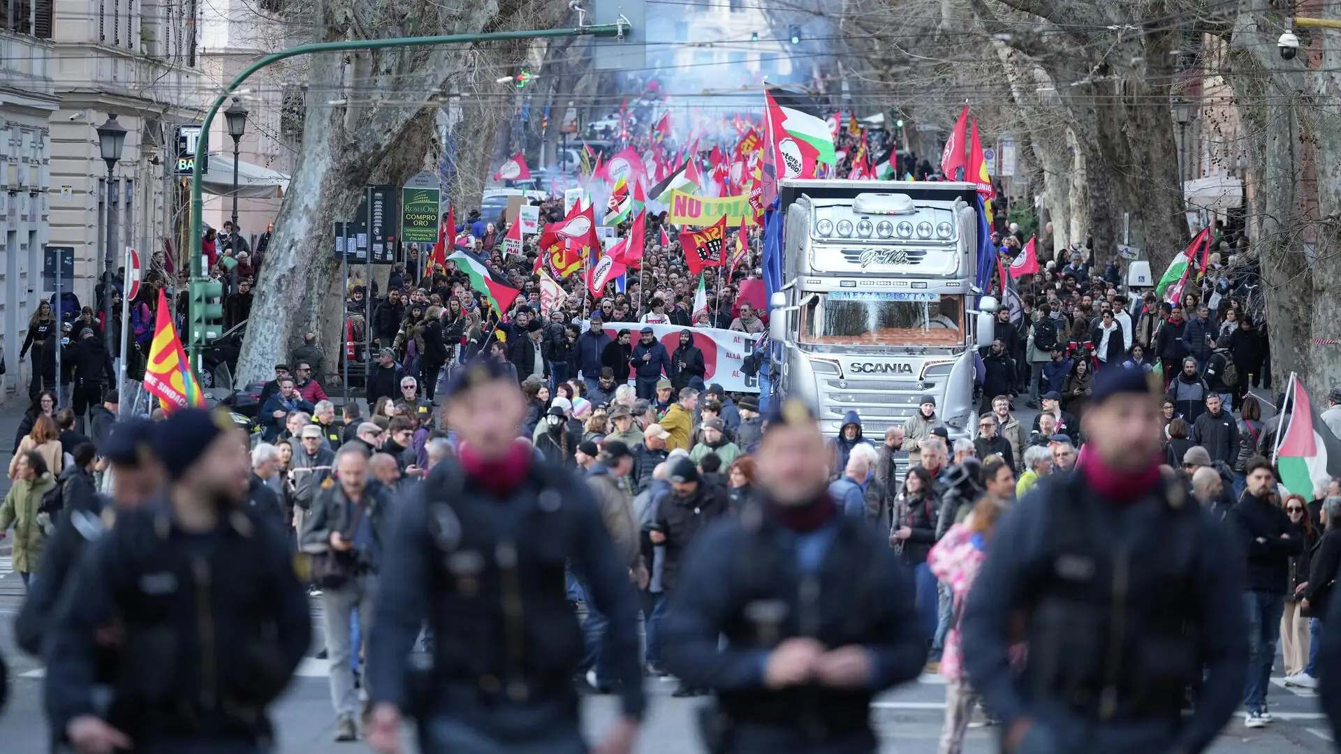 В ходе нынешней манифестации ее участники сожгли изображения премьер-министра Джорджи Мелони и главы Минюста Карло Нордио. Шествие также выступило в поддержку Кубы, Ирана и Венесуэлы и выразило несогласие с планами перевооружения Евросоюза. Активисты несли плакаты «Нет войне» и «Бесчеловечные западные демократии», скандируя требования об отставке правительства Мелони.