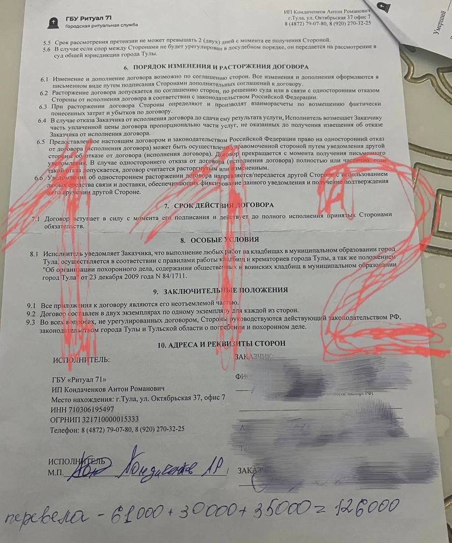 История длится с декабря, и ситуация до сих пор неразрешена. Недавно у женщины погиб брат на СВО. Спустя несколько месяцев умерла их мать, тяжело переживавшая утрату сына. После смерти матери семья обратилась в ритуальное агентство, которое нашла в интернете. Агент приехал быстро, примерно через 20 минут, и они подписали договор на сумму 126 тысяч рублей. Деньги были переведены полностью: сначала предоплата, затем оставшаяся часть по просьбе представителя службы.