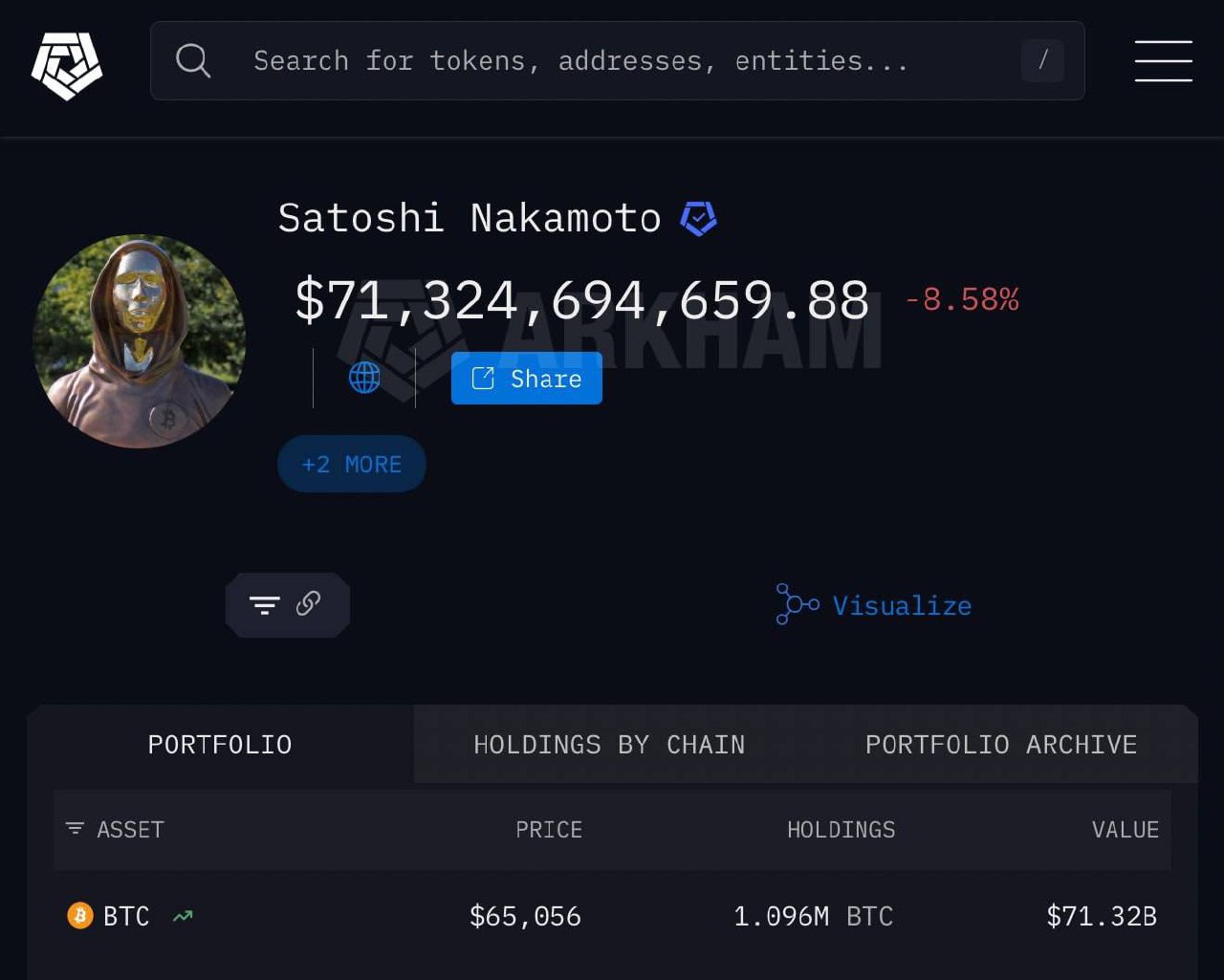 Сатоши Накамото потерял $60 млрд — за последние пять месяцев его состояние сократилось на 47%. Для сравнения: капитализация Роснефти примерно $55 млрд. Сейчас на кошельке создателя биткоина хранятся около 1,1 млн BTC. По текущему курсу это $71,3 млрд.