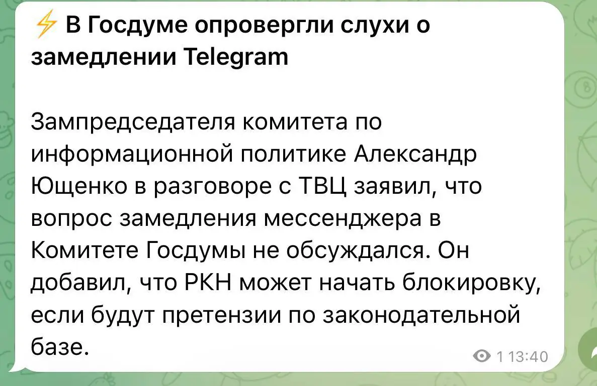 Зампредседателя комитета по информационной политике Александр Ющенко заявил, что вопрос замедления мессенджера в Комитете Госдумы не обсуждался. Он добавил, что РКН может начать блокировку, если будут претензии по законодательной базе
