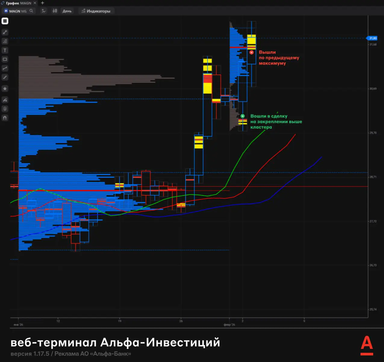 Трейдер за день заработал 280 тыс. рублей на акциях ММК — ему помог веб-терминал Альфа-Инвестиций. Он показал уровни высокого спроса и предложения на графике. Иными словами, стало видно, какие акции активно скупали игроки рынка.