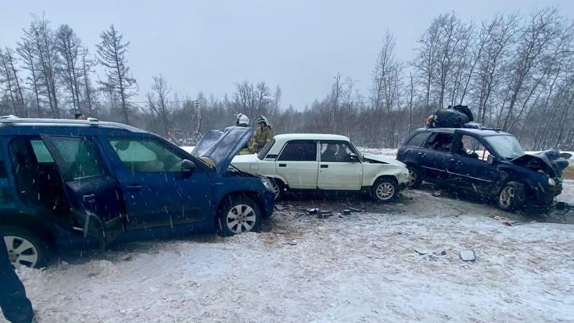 Как уточняет ведомство, в 15.59 мск воскресенья на подъезде к Великому Новгороду со стороны Санкт-Петербурга в Новгородском округе 55-летняя женщина, управляя Lada Kalina, выехала на полосу встречного движения и столкнулась со Scoda Yeti. От удара автомобиль Scoda столкнулся с «ВАЗ 2107».