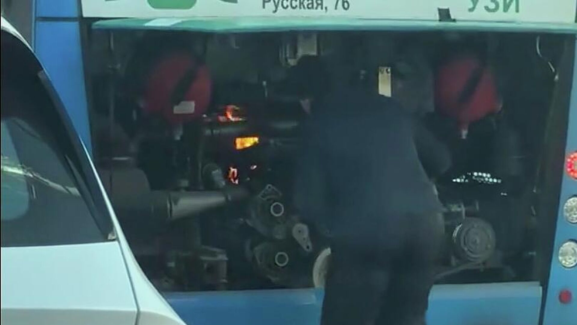 В соцсетях разошлось видео, на котором водитель стоящего на светофоре автобуса открывает его задний отсек, внутри что-то горит. Мужчина вытаскивает горящие фрагменты, бросает их на землю и закрывает крышку. В соцсетях утверждается, что после этого он продолжил поездку с пассажирами.