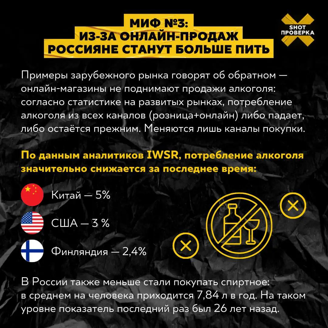 В России планируют начать эксперимент с проверкой возраста через биометрию при онлайн-продаже энергетиков. На основе этого в дальнейшем также хотят запустить доставку российского вина на дом. Такие изменения на рынке вызывают много споров и обрастают слухами: якобы онлайн-продажа увеличит потребление спиртного. Мы решили подробно разобраться в вопросе — так ли это на самом деле?
