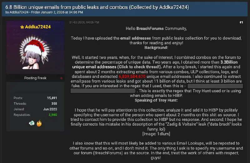 В сеть утекли 6,8 млрд email-адресов. Хакер выложил архив на 150 ГБ с миллиардами почтовых данных, собранных за два года из старых утечек и разных источников. Подлинность части базы уже подтвердили эксперты. Специалисты советуют срочно сменить пароли и включить двухфакторную защиту в важных сервисах