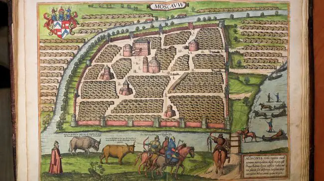 Перспективный план центральной части Москвы – расширенный и переработанный план С. фон Герберштейна из второго тома Атласа городов Г. Брауна и Ф. Хогенберга. Кёльн, конец XVI — начало XVII вв.