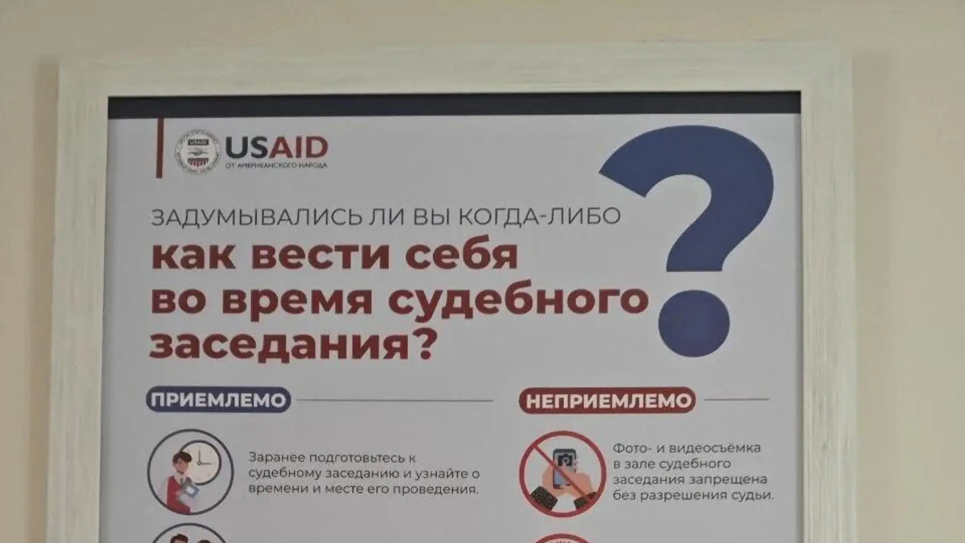 На информационных стендах под заголовком «Задумывались ли вы когда-либо, как вести себя во время судебного заседания?» американское агентство дает гражданам указания, что является «приемлемым», а что «неприемлемым» в зале суда. В частности, USAID рекомендует молдаванам «одеваться просто и прилично», не спорить с судьей и являться на заседания заранее.