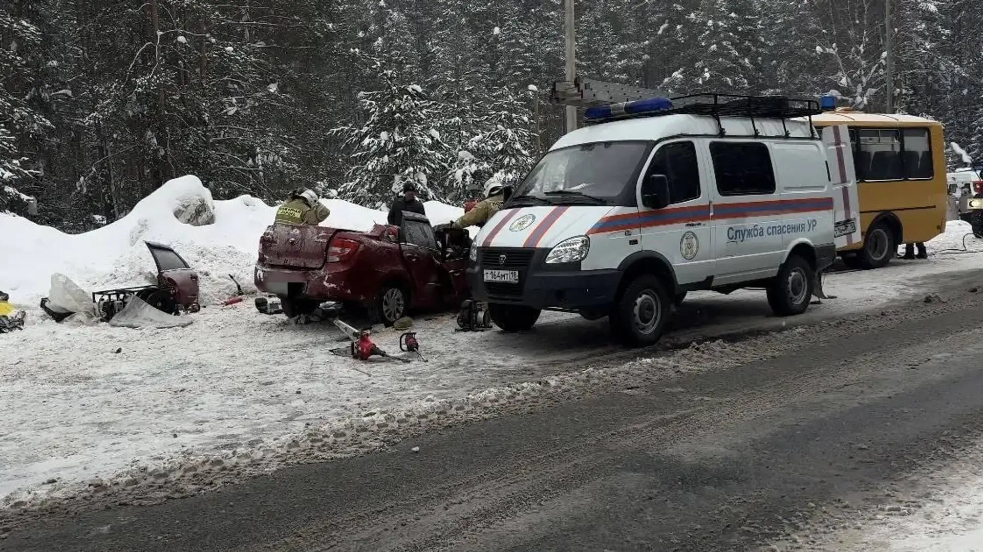 «Водитель автомобиля… не справилась с управлением, выехала на полосу дороги встречного движения, где совершила столкновение со школьным автобусом… В результате ДТП 87-летний мужчина — пассажир автомобиля погиб на месте, водитель данного автомобиля с полученными травмами госпитализирован. Также получила травмы и доставлена в медучреждение пассажир школьного автобуса — 12-летняя девочка», — сообщило ведомство в Telegram-канале.
