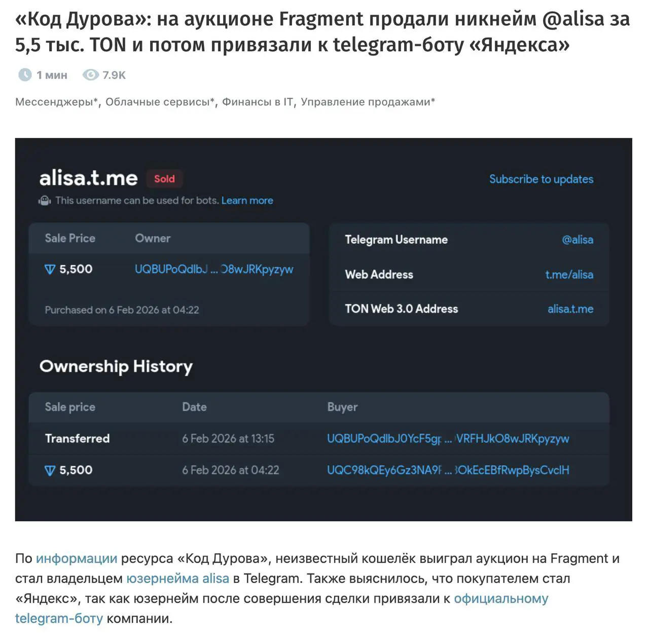 Яндекс забрал себе один из самых «говорящих» ников в Телеграм — компания купила юзернейм @alisa для нейросети Алисы AI за 5,5 тысяч TON. Это около 585 000 рублей по текущему курсу.