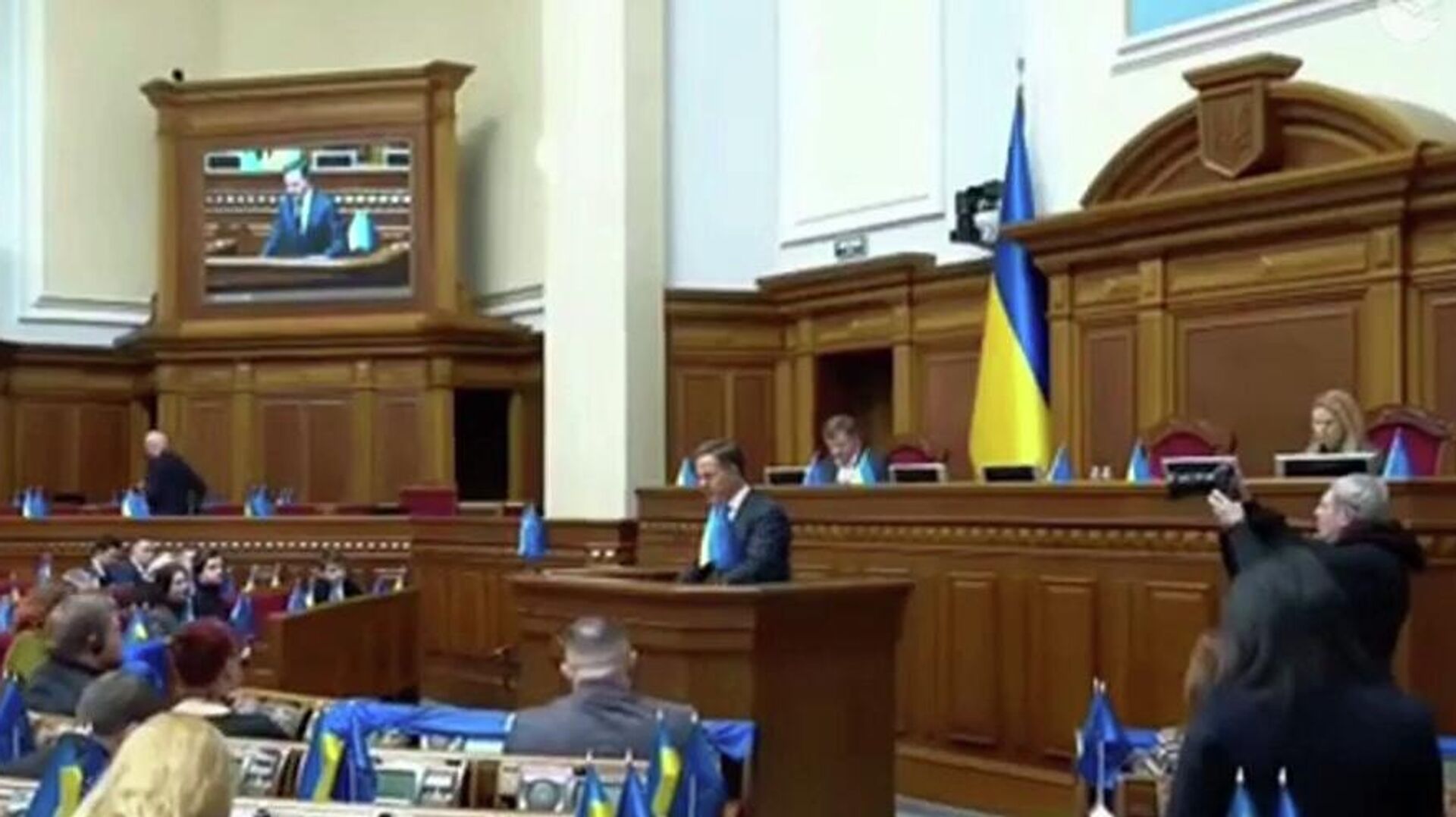 Во вторник Рютте выступал с трибуны украинского парламента в ходе своего визита в Киев. В эфире телеканала «Рада» были видны наполовину пустые ряды кресел и небольшое количество депутатов.
